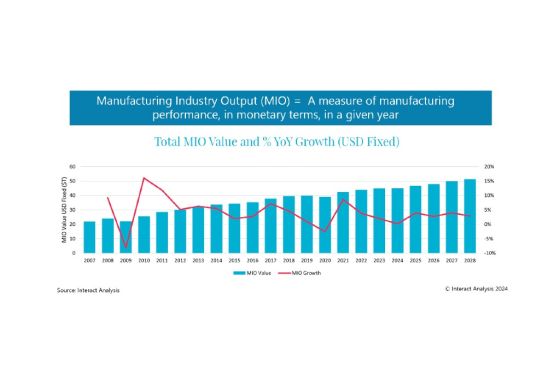 Although Interact Analysis has lowered growth forecasts for 2025 in its latest Manufacturing Industry Output Tracker (MIO), this is the result of a slightly improved global outlook for the end of 2024, which will in turn see most economies finish the year in a stronger position. A slight dip in the growth rate is anticipated in 2026, but manufacturing output is expected to maintain a relatively steady positive trajectory out to 2028.