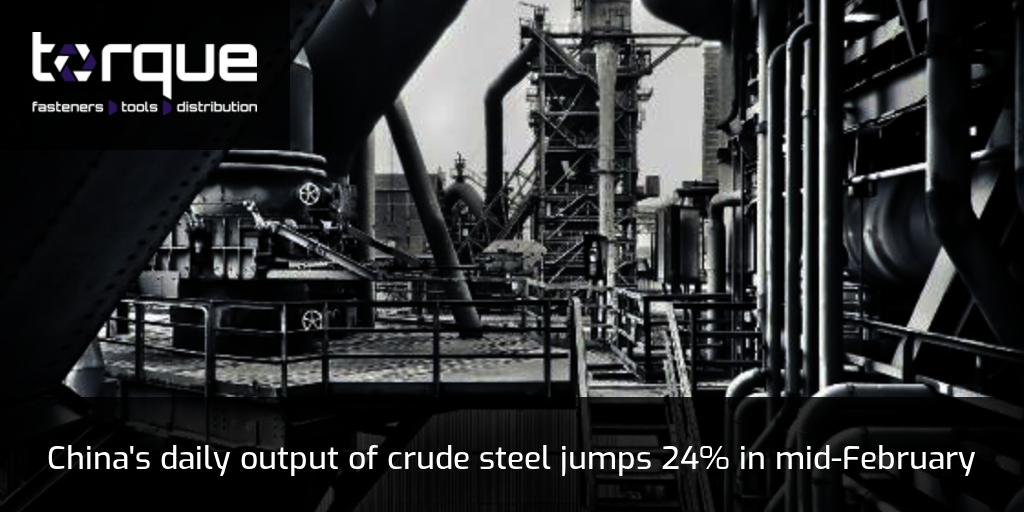 China's major steel mills saw their average daily output of crude steel rise 24.38 % year-on-year in mid-February, according to data from the China Iron and Steel Association.